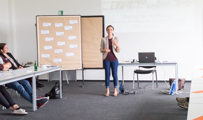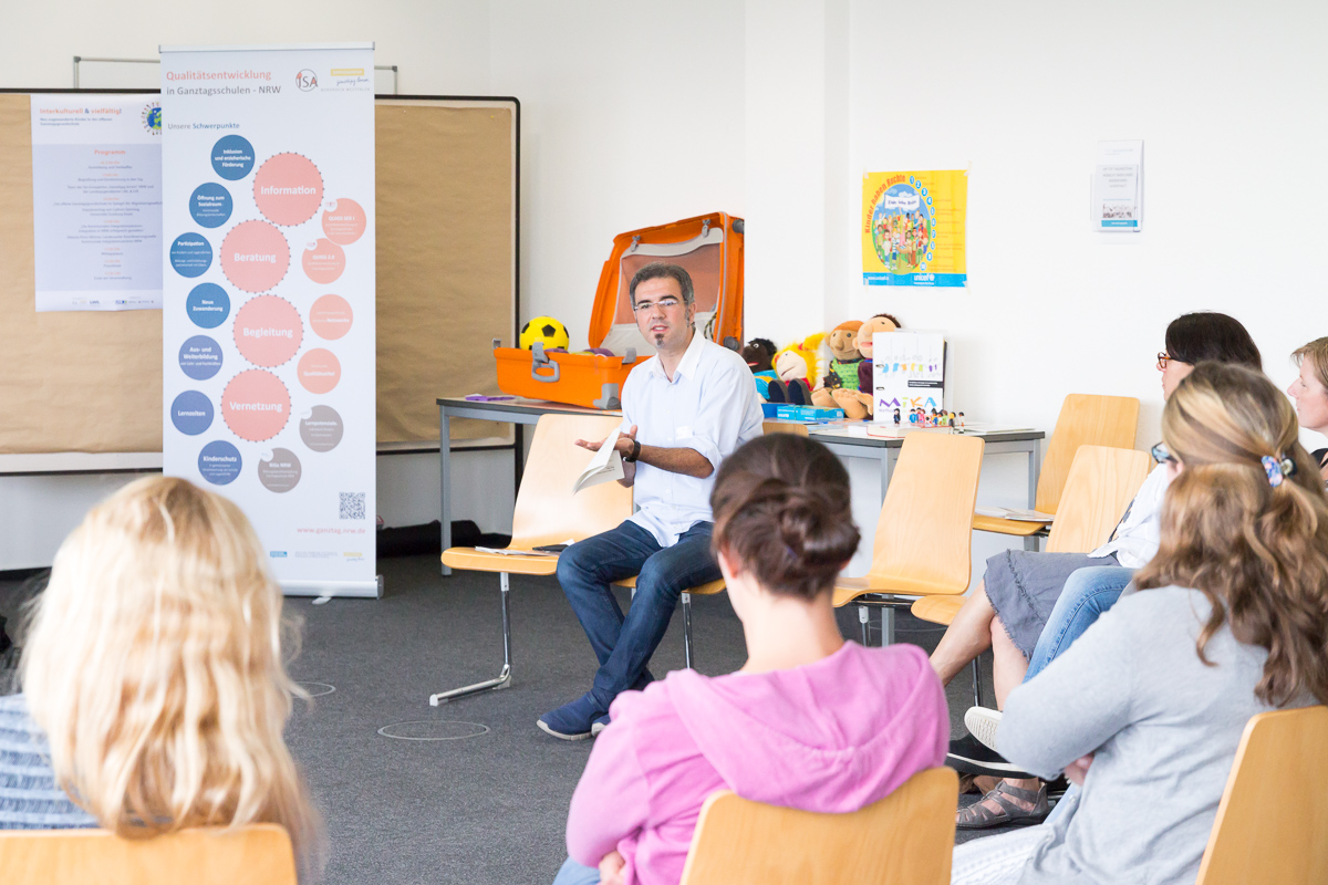 Vertiefend wurde in den Praxisforen diskutiert, welche interkulturellen und traumapädagogischen Kompetenzen für Lehr- und Fachkräfte in Ganztagsschulen hilfreich sind, wie Sprachbildung mit Hilfe einer „Sprachbrille“ in den pädagogischen Alltag integrierte werden kann und welche Möglichkeiten der Anti-Bias-Ansatz zum vorurteilsreflektierten Arbeiten in der Praxis bietet.